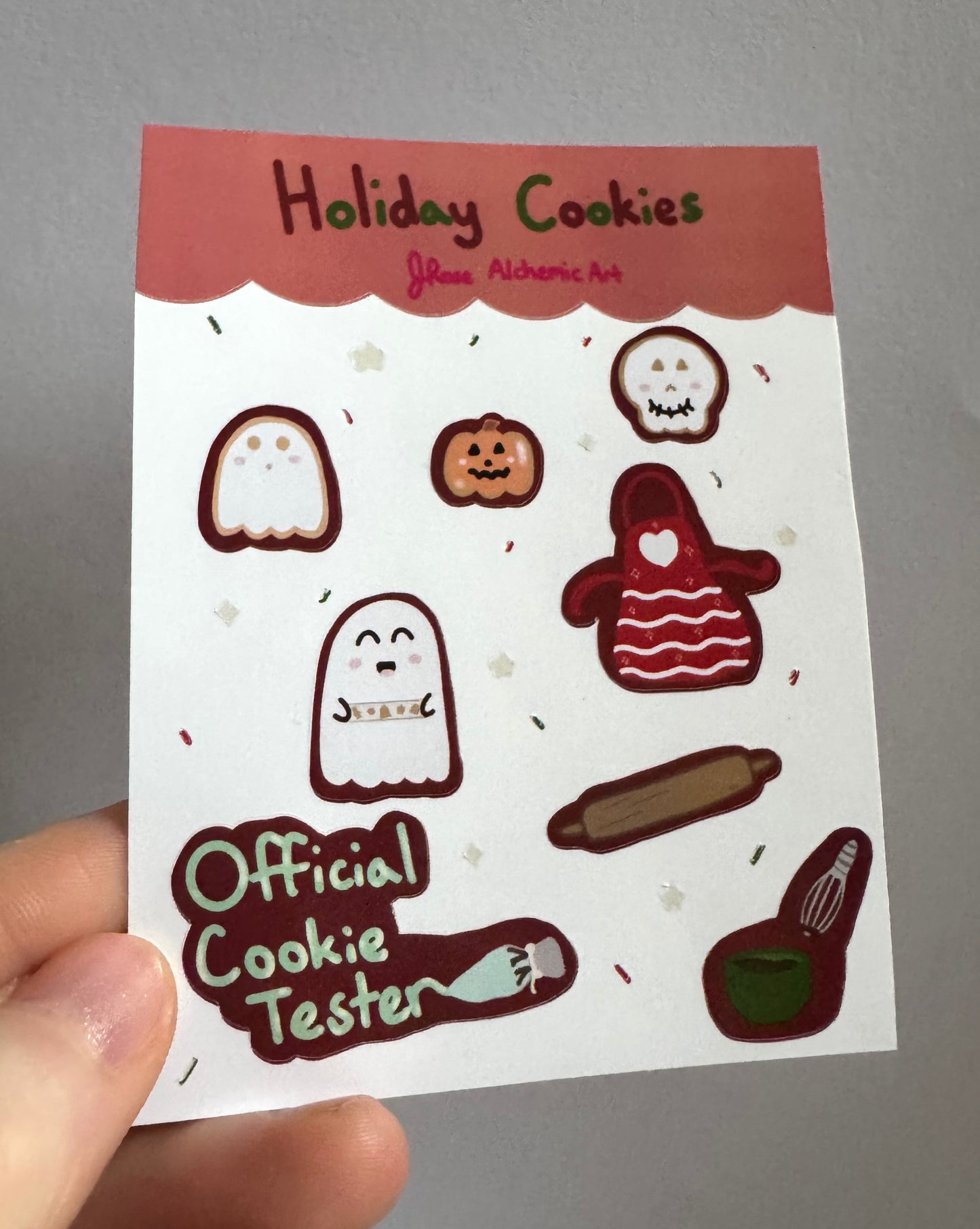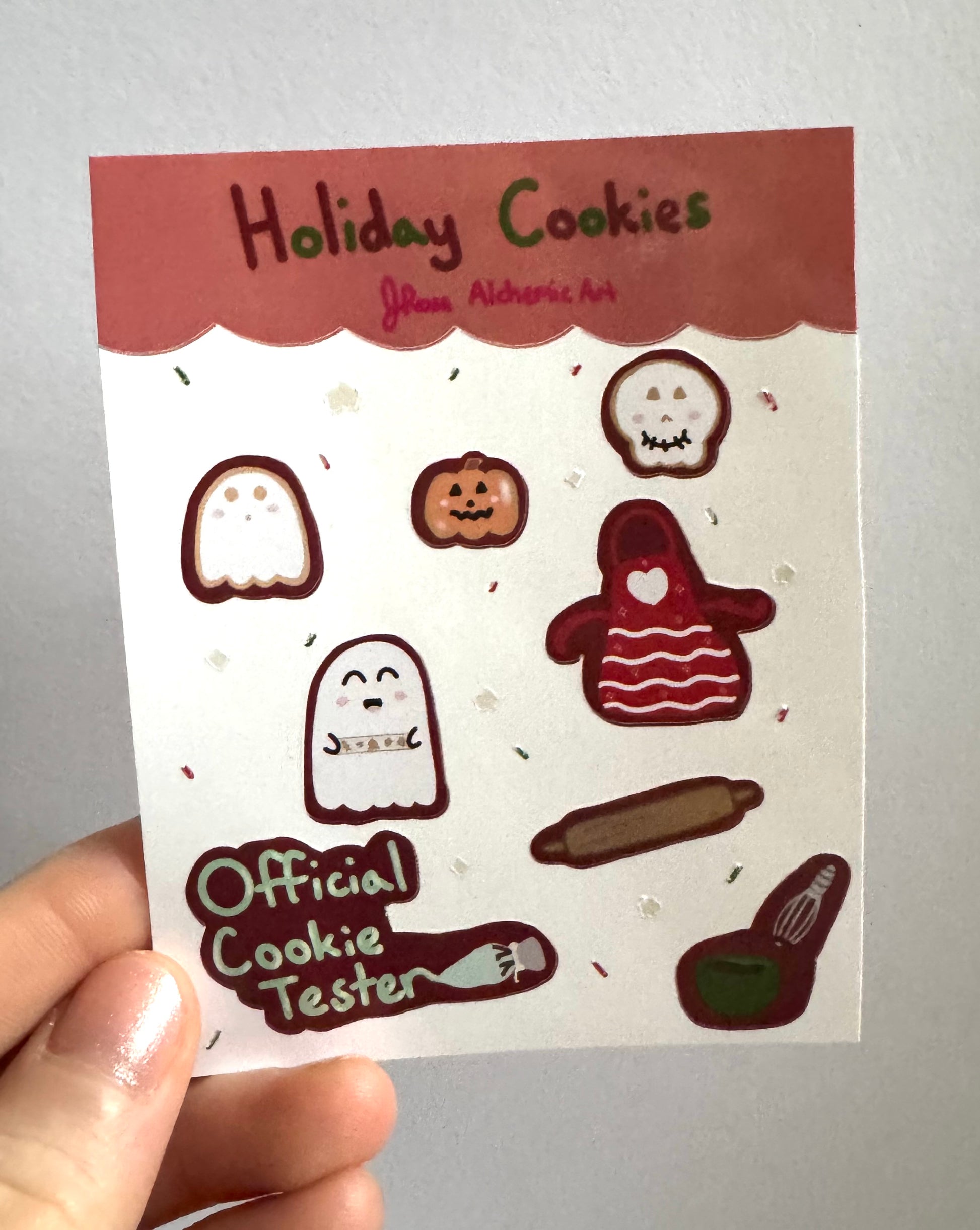 An adorable white glossy sticker sheet for all of the cookie lovers! The design features a ghost making cookies, different holiday cookie designs, and a bowl of cookies being mixed! Perfect for any cookie and ghost lover!