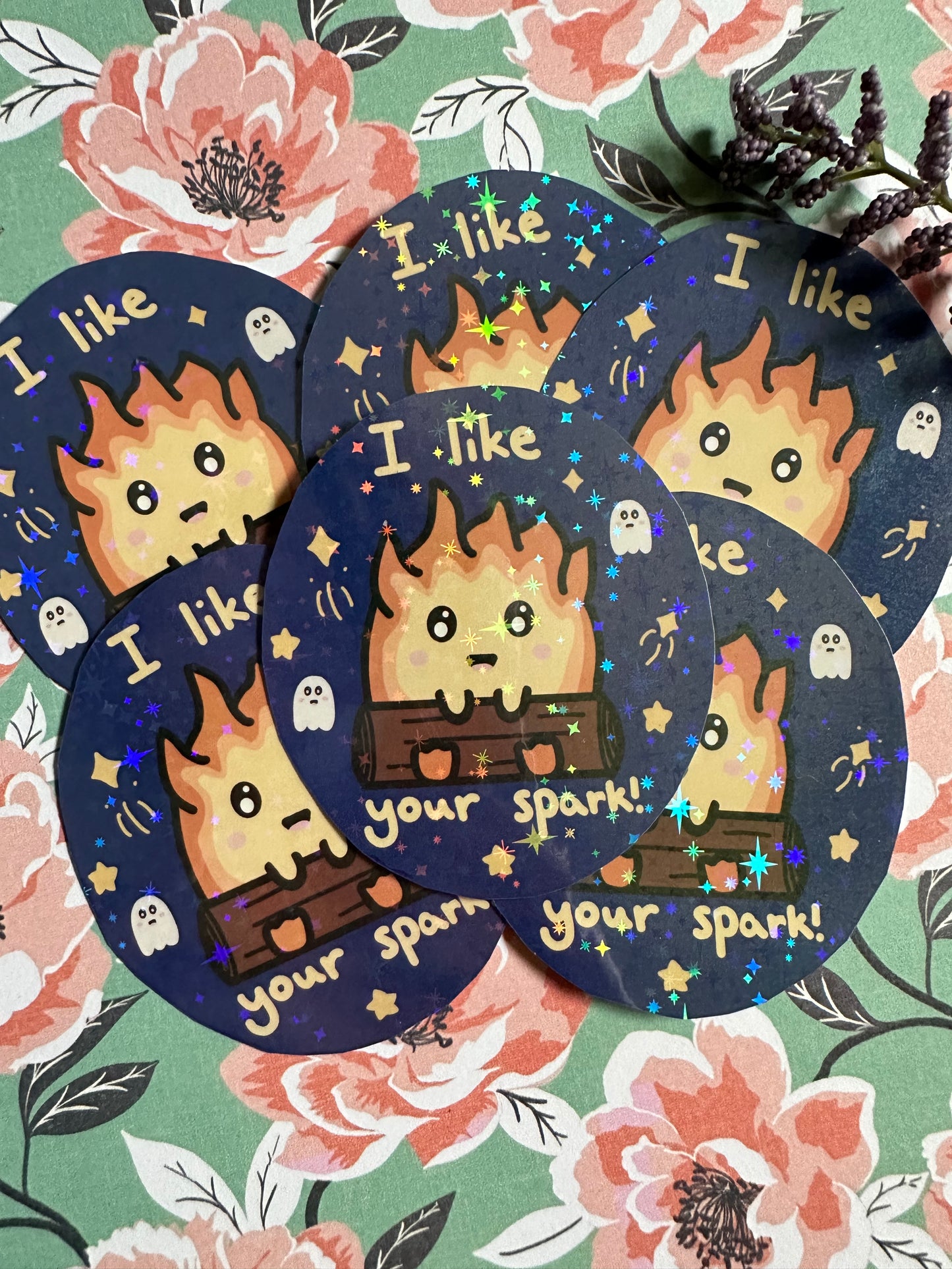 A very cute fire friend wants to let you know they like your spark! Along with the fire spirit, there are also some ghost friends and stars to brighten your day/night! Printed on sparkly vinyl sticker paper.